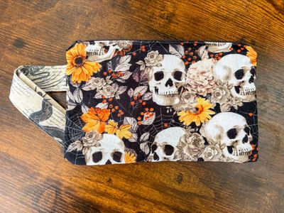 0 savesFeaturing a hauntingly beautiful mix of skulls, spiders, and vintage-style script set against rich florals and webs, this pouch perfectly blends gothic charm with a hint of whimsy. The contrasting bow and matching wrist strap complete the look, making it as practical as it is eye-catching.