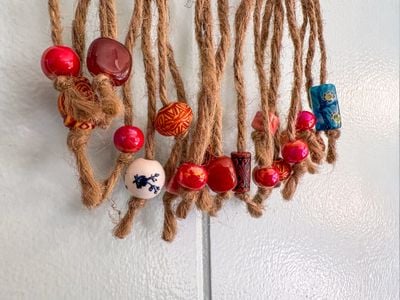 Materials: copper wire, jute twine, mixed beads (wood, glass, ceramic, resin)