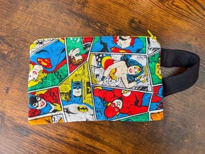 0 savesThe colorful superhero print gives it a fun, vintage vibe, while the oversized black bow adds a bold, stylish touch. Perfect for carrying your essentials—phone, keys, wallet, or makeup—this pouch is both practical and eye-catching. The soft cotton fabric, secure zipper, and handy wrist strap make it easy to take your hero energy anywhere you go.